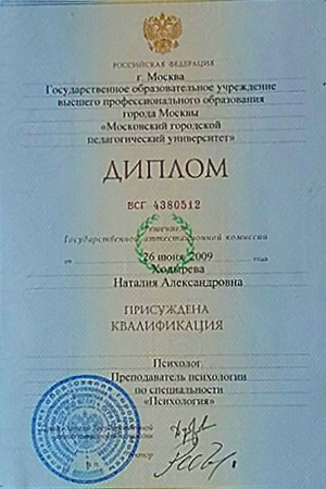 Государственное образовательное учреждение высшего профессионального образования города Москвы «Московский городской педагогический университет» специальность: психолог, преподаватель психологии по специальности «психология».